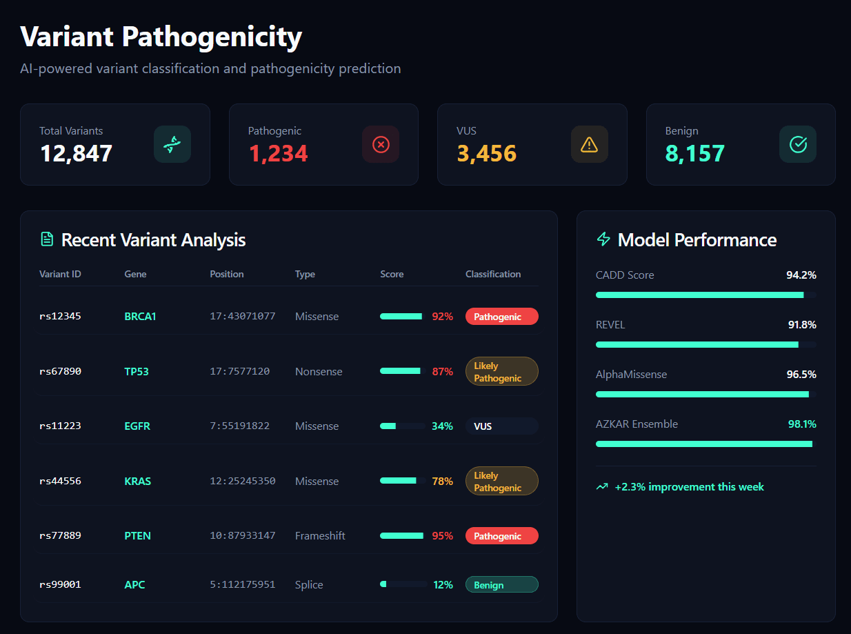 We built precise classifiers that integrate variant-level feature matrices with phenotype mappings. These models predict whether a genetic variant is likely pathogenic.