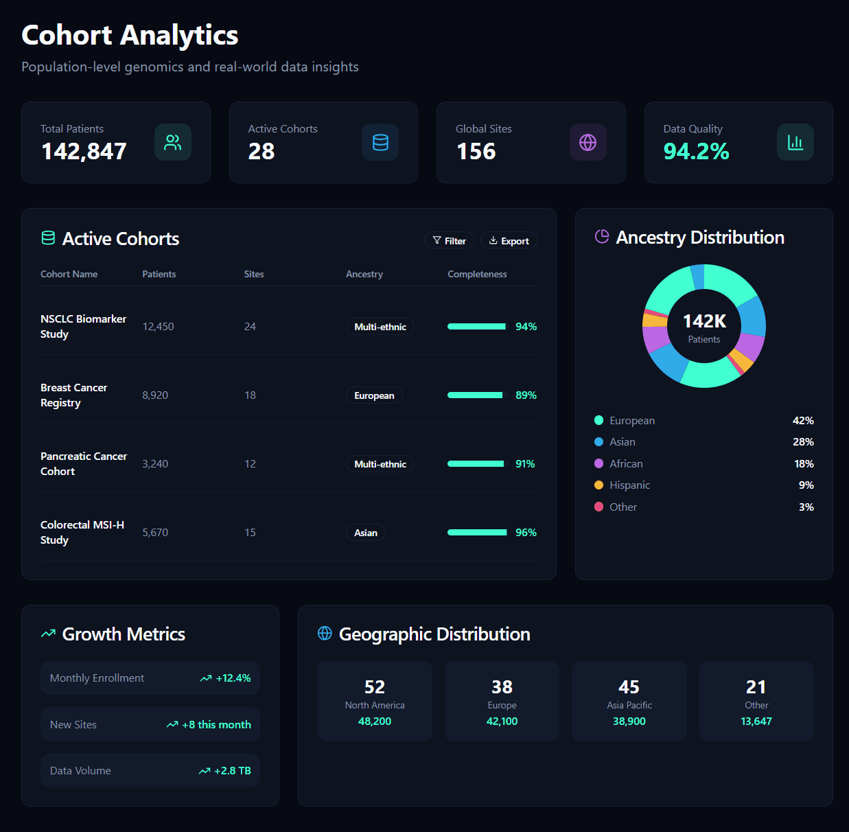 Precision epidemiology at computational scale, this module enables real-time stratification and analysis across entire biobank-sized cohorts. It supports cohort comparison, case–control association scans, founder-mutation detection, and longitudinal trend analysis.