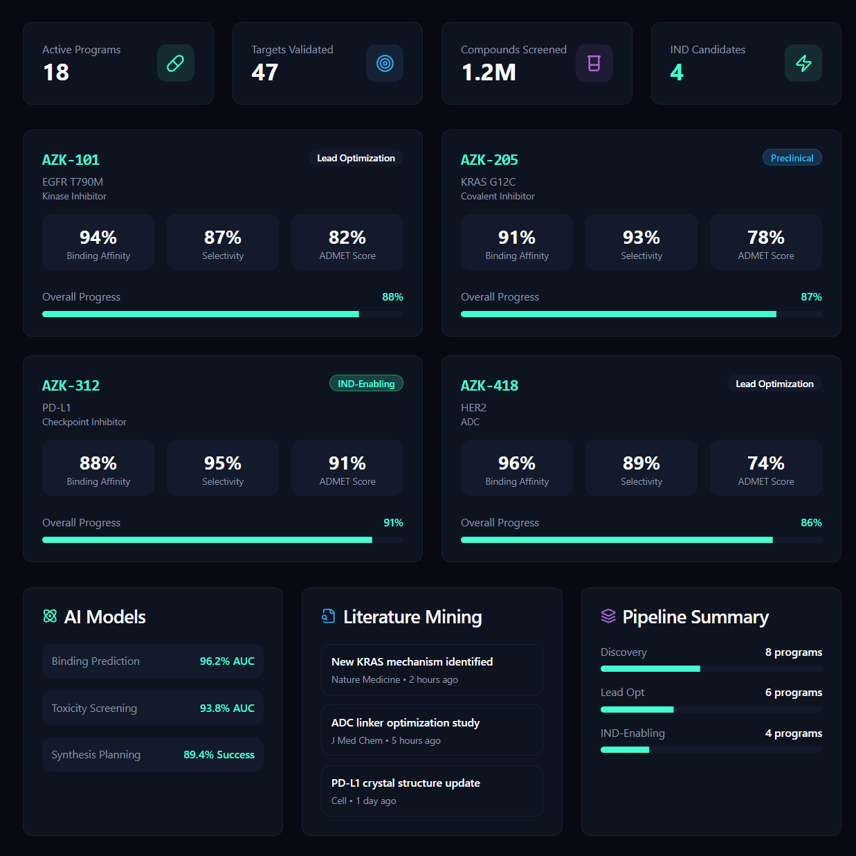 Turning genomic signals into therapeutic strategy, AZKAR ingests large variant datasets, disease-specific cohorts, and functional annotations to automatically surface genes, pathways, and molecular mechanisms enriched in affected populations. Using multi-omic feature integration and model-agnostic statistical enrichment, the module identifies high-confidence therapeutic targets, ranks them by perturbation impact, and cross-references druggability, existing compounds, and structural biology databases.