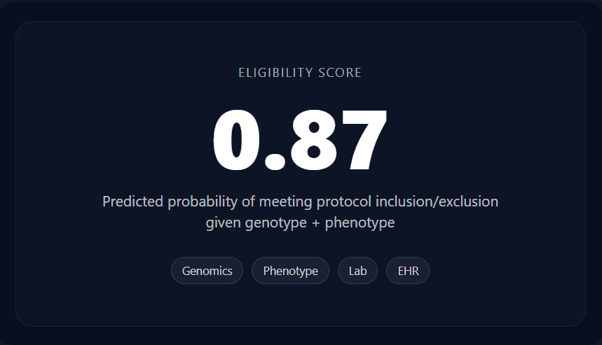 This layer predicts the probability of a patient being eligible for a specific trial. It fuses genotype-derived features with structured criteria from trial protocols. The output is a ranked list of trials, prioritizing those with the highest likelihood of inclusion.