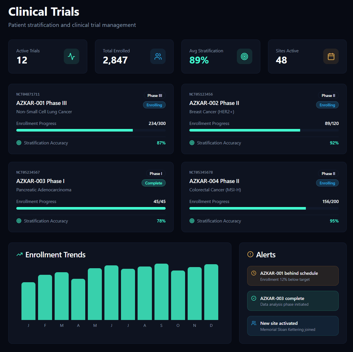 AI-enabled, precision engineered. AZKAR is a vertically integrated clinical trial genomics intelligence platform empowering investigators finding high-likelihood responders by fusing genomic variant signals with clinical criteria.